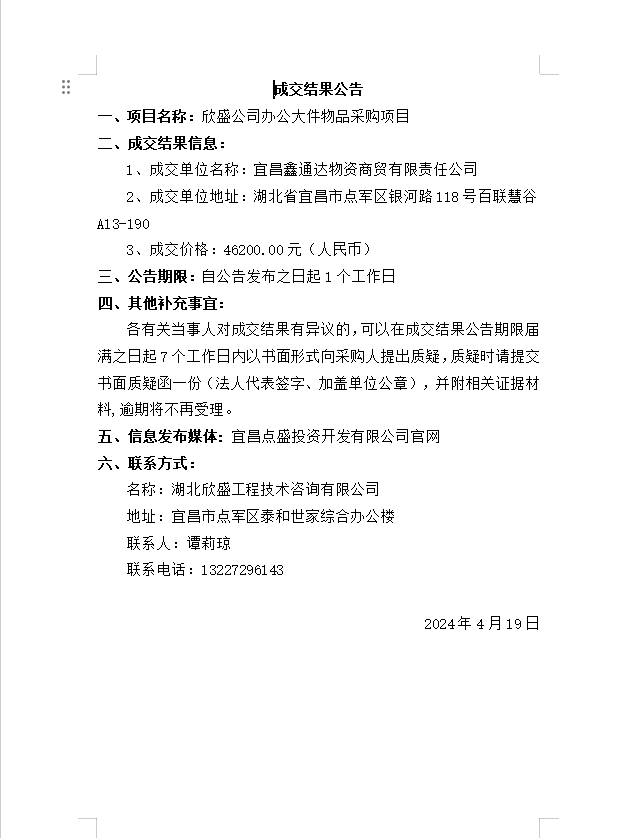 欣盛公司辦公大件物品采購(gòu)項(xiàng)目成交公告
