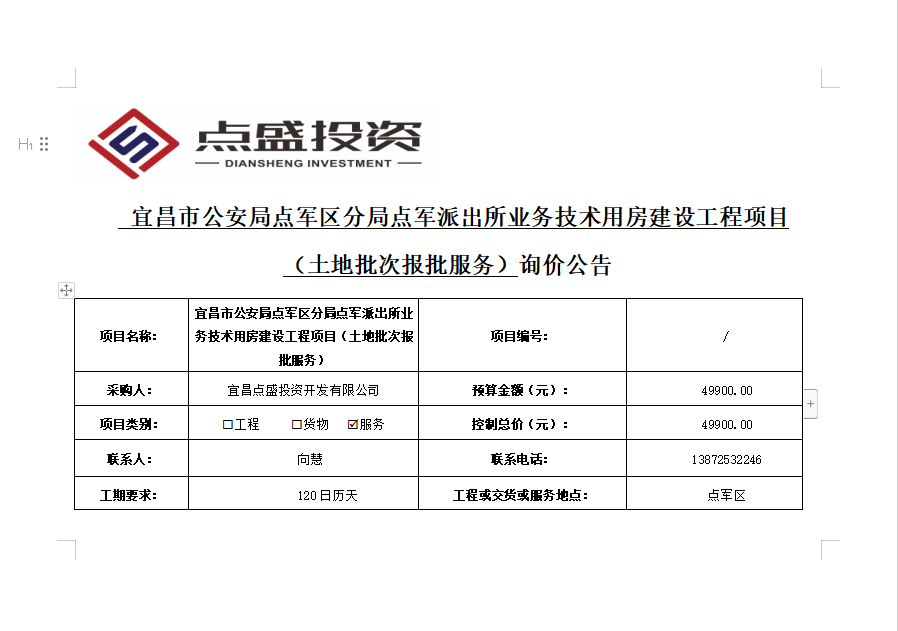 宜昌市公安局點軍區(qū)分局點軍派出所業(yè)務(wù)技術(shù)用房建設(shè)工程項目 (土地批次報批服務(wù))詢價公告