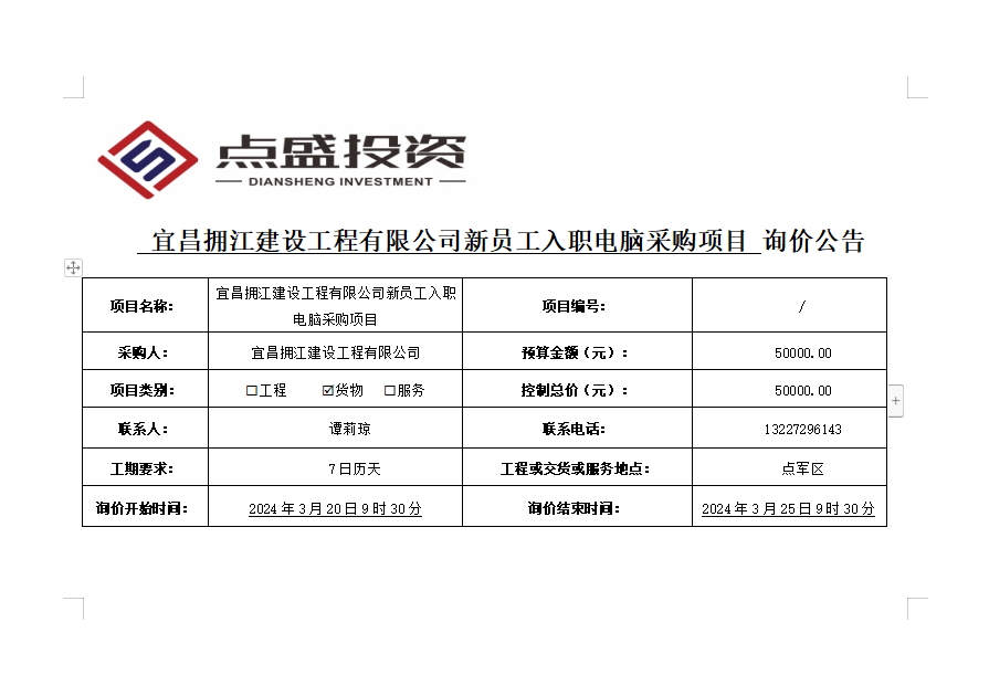 宜昌擁江建設工程有限公司新員工入職電腦采購項目詢價公告